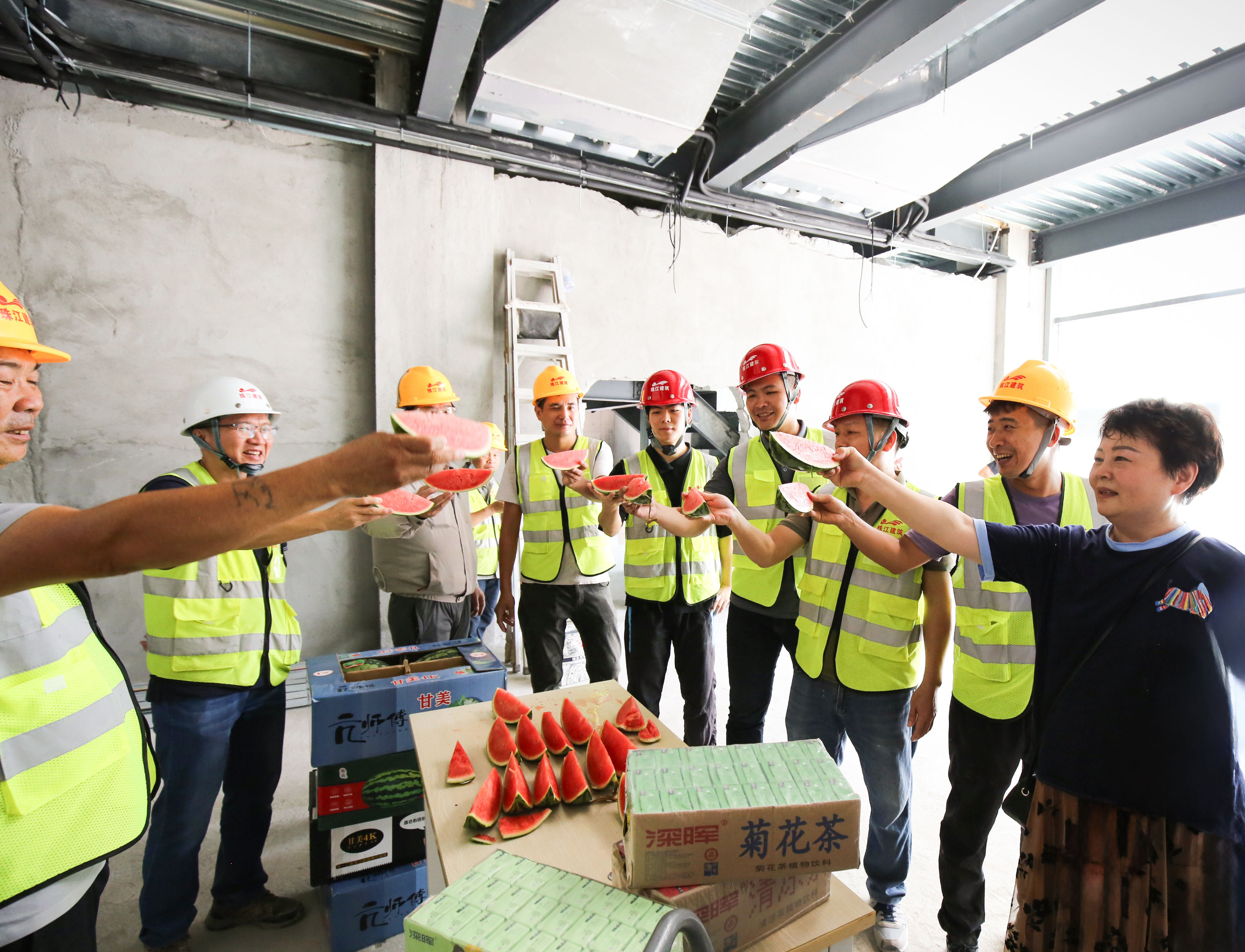 入伏以来,酷暑难耐,面对滚滚热浪,公司各在建项目的一线职工始终鏖战在钢筋水泥之间,用汗水丈量进度,用坚守诠释担当。为切实做好高温季节防暑降温工作,保障高温岗位职工健康安全,公司工会慰问组近日开展高温慰问活动,带着西瓜、藿香正气水、清凉饮品等防暑降温物资前往前往健力宝华南运营总部、乐比健康生物医药企业总部及产品研发生产基地、沙湾金寺围二期项目精装修工程、三联“新水河”地段项目外立面工程等项目。