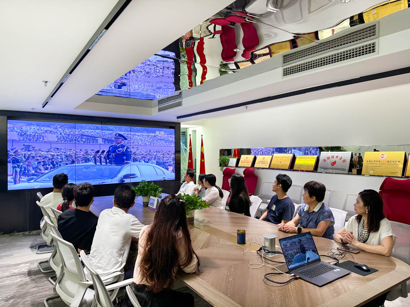 随着中共中央总书记、国家主席、中央军委主席习近平发表重要讲话,会议室响起热烈掌声。受阅部队军容严整、意气风发,铁甲战车整齐列阵、威风凛凛。护旗方队迈着铿锵步伐护送国旗入场,威武的受阅部队列阵通过天安门、先进的武器装备依次亮相、8万余和平鸽展翅高飞、8万只气球腾空而起,一幕幕震撼人心的画面,让在场观看直播的同事们爆发出阵阵赞叹,爱国情怀与民族自豪感油然而生,深切感受到国家日益强大,为祖国国防力量的现代化发展感到无比自豪。